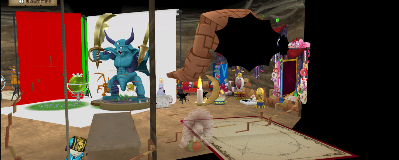 この状態で入口から「配置中の家具」を選択してのってるものを動かすと暗黒空間とかの本来配置できない場所に行けたり・・・。
