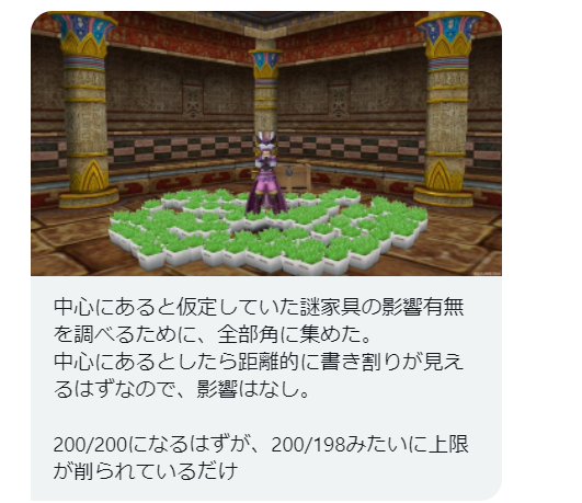 現状キャラから一番遠い家具が消失するのだから謎家具があるなら場所を変えれば消失する位置も変わるのではという説。